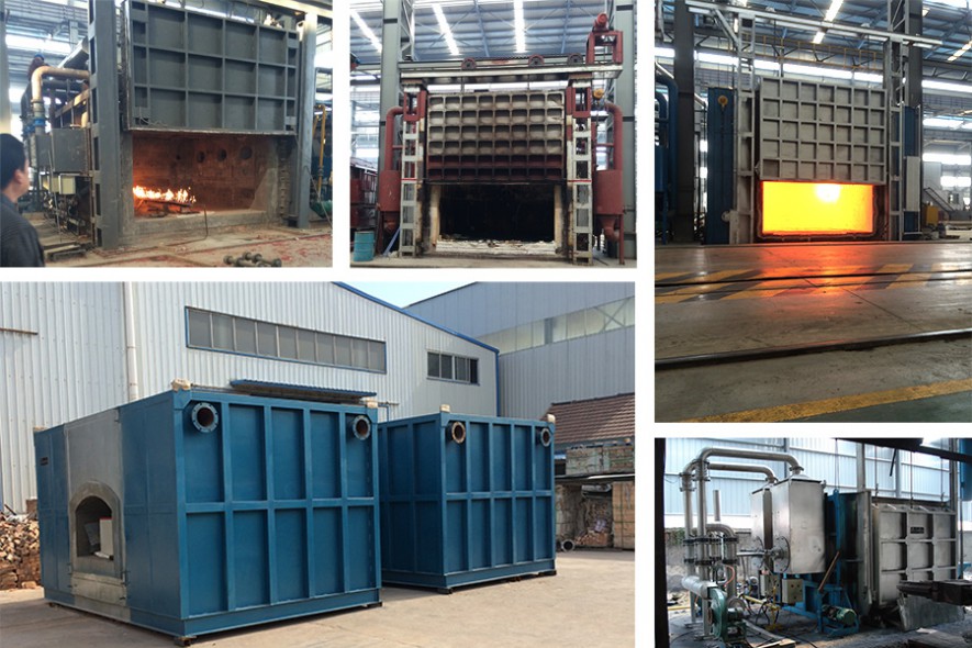 蓄熱式天然氣節能鍛造爐爐底單位鋼錠放在爐底上面的耐熱鋼滑道上,由設置在裝面積產量約為250一400kg/(mZ·h),單位熱耗約為料端的推鋼機向出料方向推進,加熱好的鋼錠多數由4.0~5.SGJ/t。設置在出料端側面的出鋼機推出爐外。推、出鋼機的推臺車式鍛造爐用于重型鋼錠的鍛前加熱。爐料力按摩擦系數為1.。計算。由吊車或專用機械裝在臺車上面的墊鐵上,墊鐵高度爐底單位面積產量約為15。